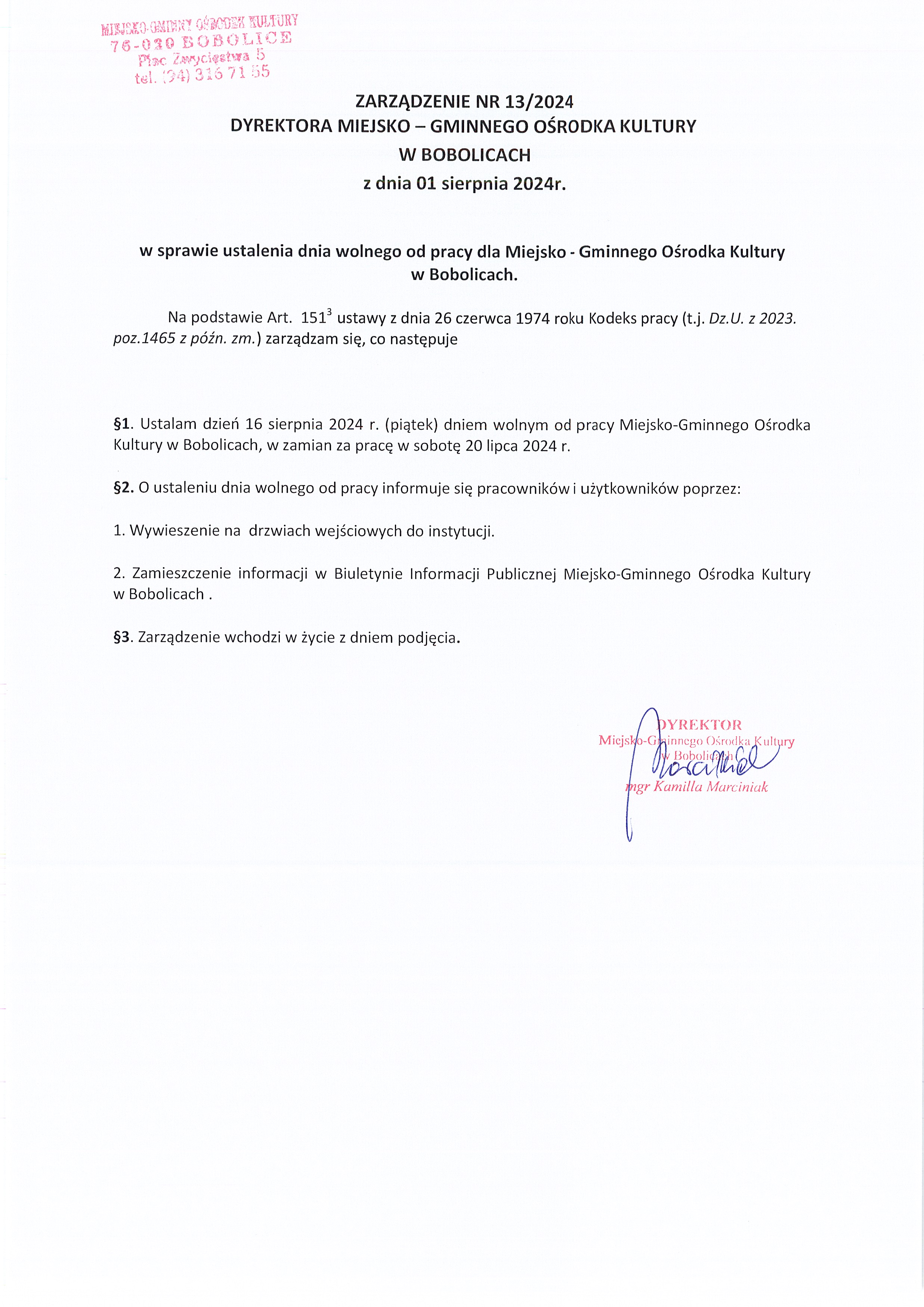 Zarzadzenie nr 13/2024 z dnia 01.08.2024 r.